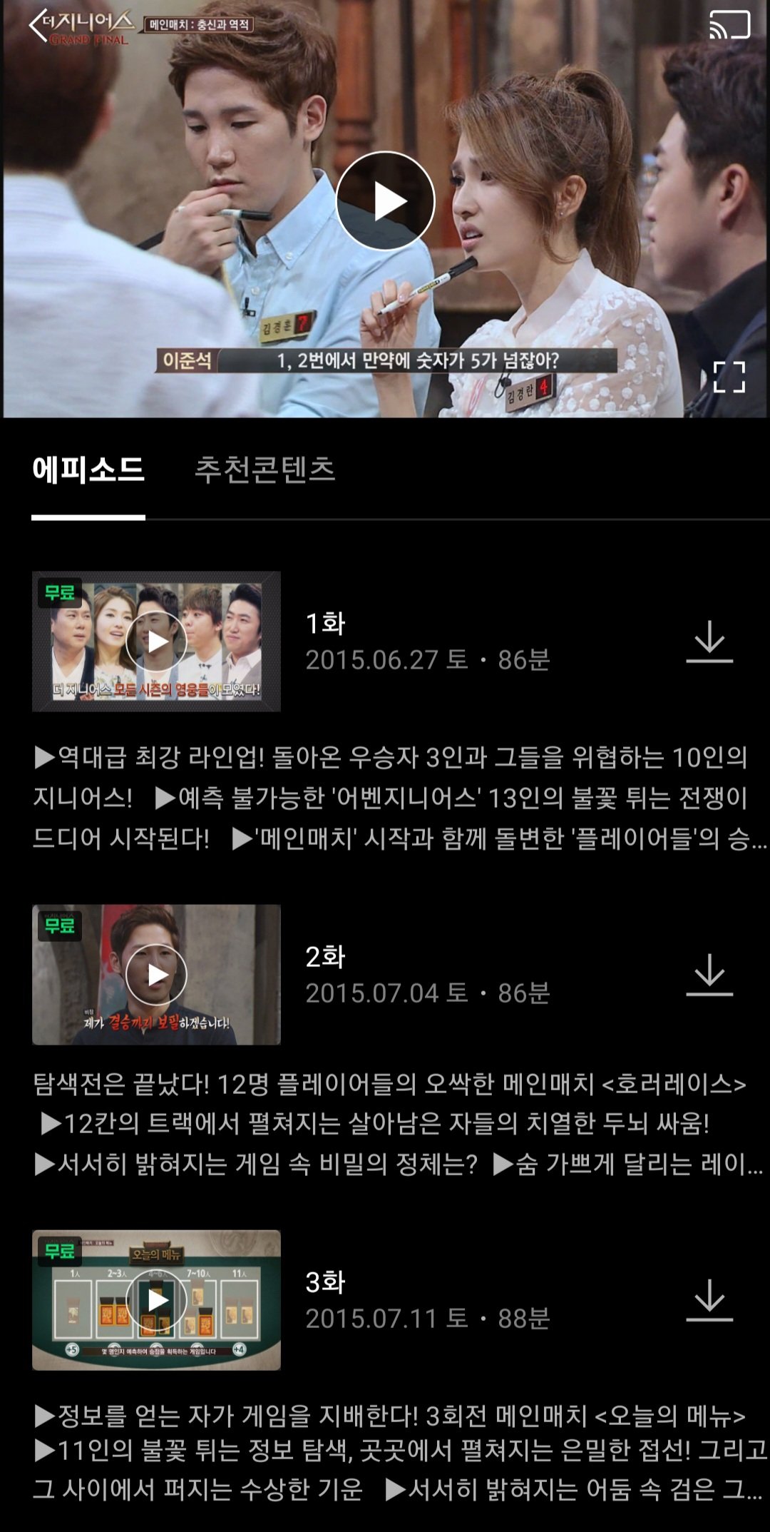 티빙에서 현재 더지니어스1,4 무료로 시청 가능
