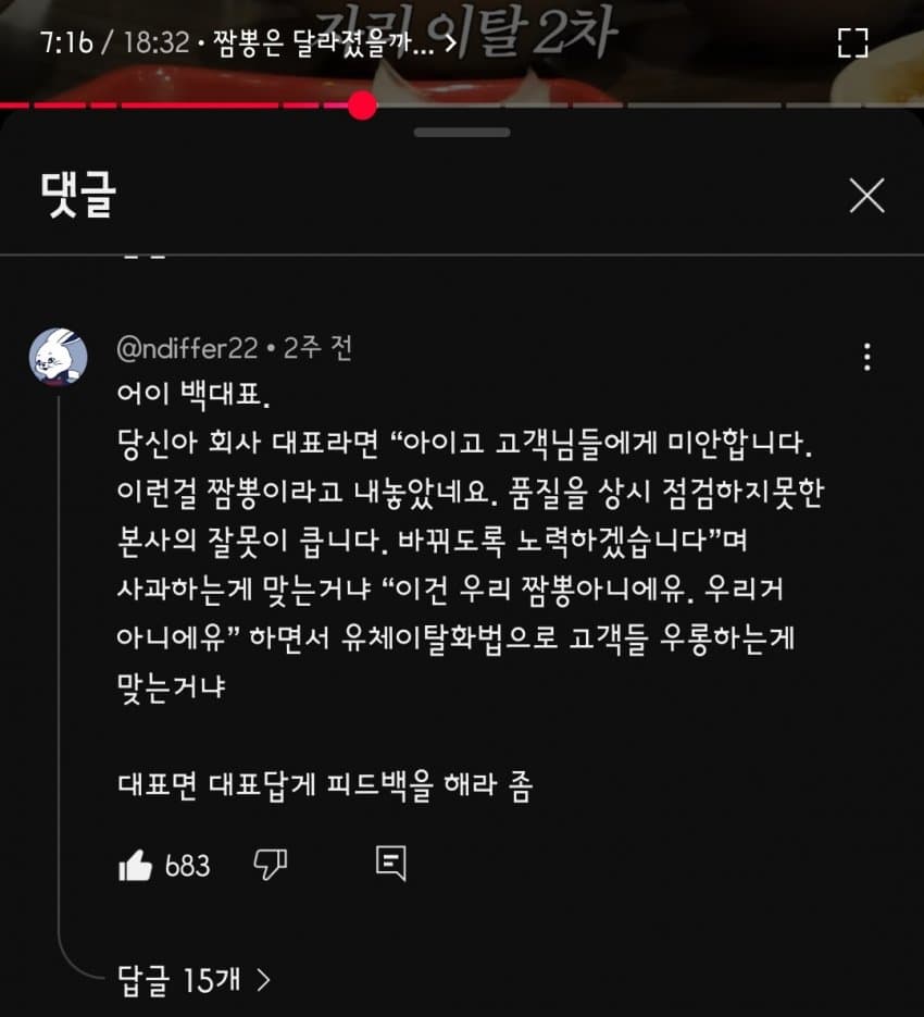 포텐 홍콩반점 짬뽕 점검 영상 일침 댓글...JPG