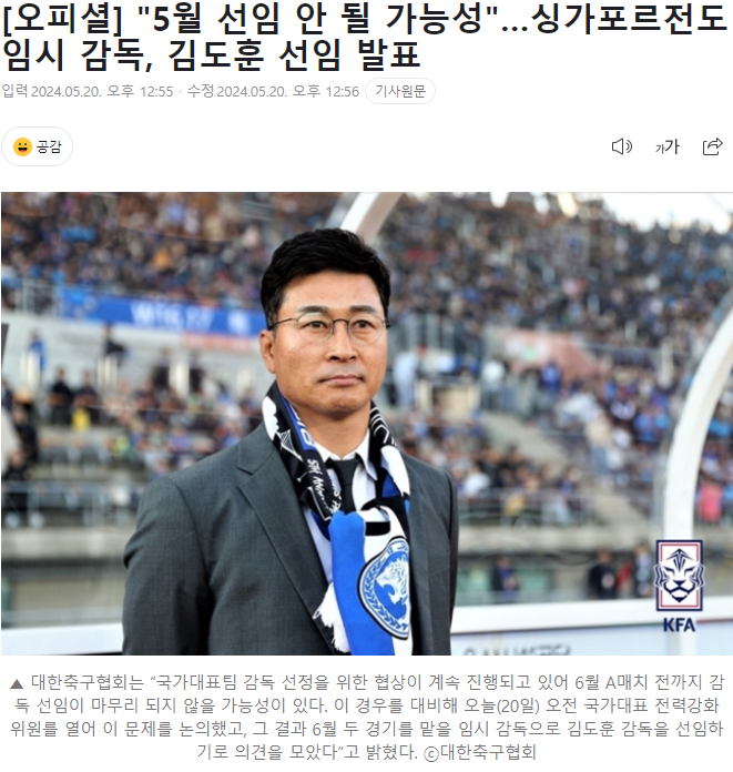 [오피셜] "5월 선임 안 될 가능성"…싱가포르전도 임시 감독, 김도훈 선임 발표
