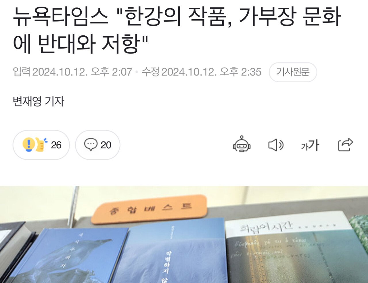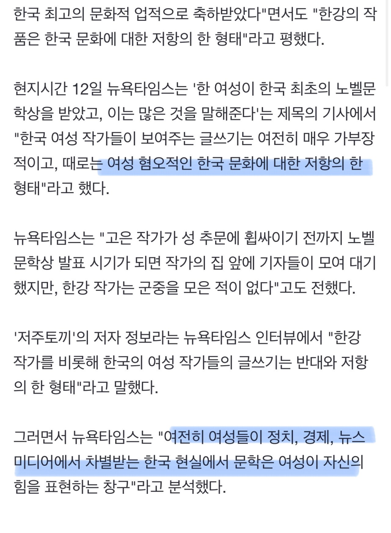 뉴욕타임스“한강, 여성 혐오적인 한국 문화에 대한 저항의 한 형태”
