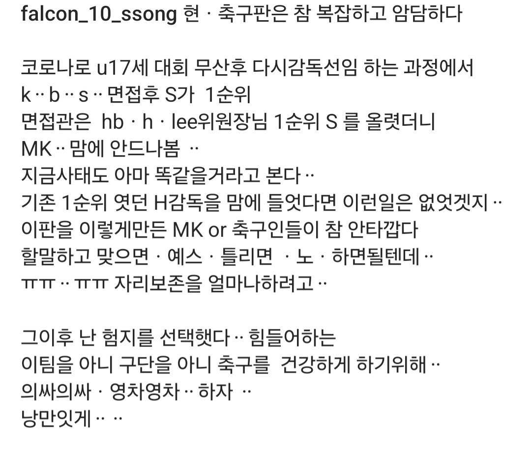 U17 대표팀 감독 선임 당시 K 감독, B 감독, S 감독 3명이 후보