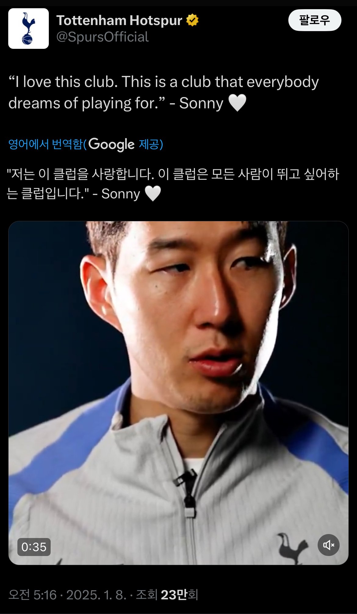 손흥민) 저는 이 클럽을 사랑합니다. 여기는 모두가 와서 뛰고 싶어 하는 곳이에요