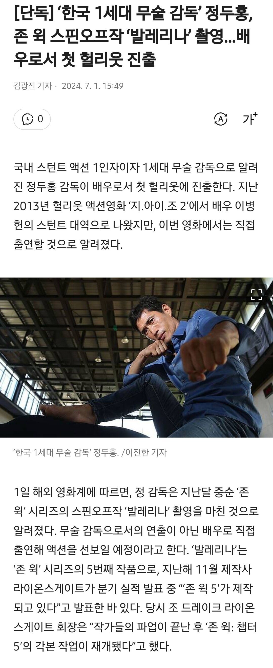 정두홍, 존 윅 스핀오프작 ‘발레리나’ 촬영…배우로서 첫 헐리웃 진출