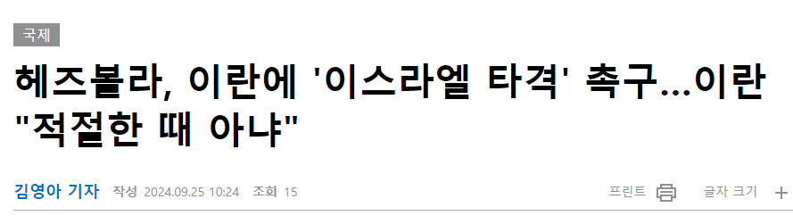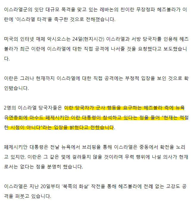 헤즈볼라, 이란에 '이스라엘 타격' 촉구…이란 "적절한 때 아냐"