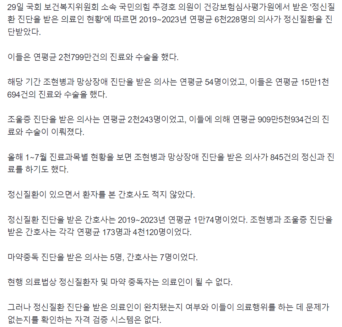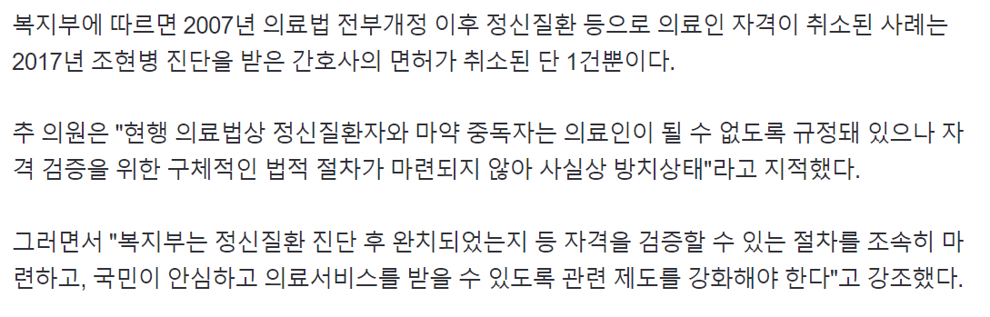 조현병 진단받은 의사가 수술…"자격검증 절차 조속히 마련해야"