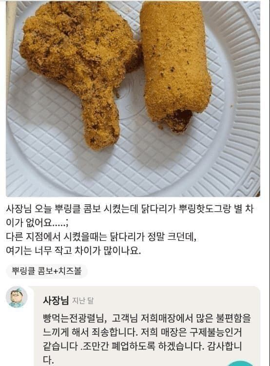 닭다리 크기 지적 받은 bhc 사장님의 대처.jpg