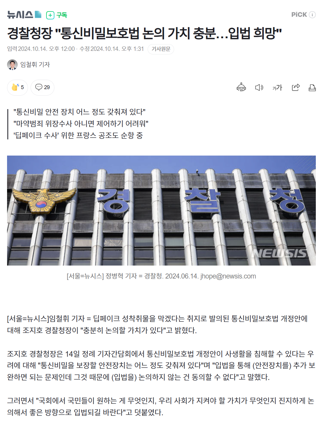 경찰청장 "통신비밀보호법 논의 가치 충분…입법 희망" & 과거 여성판 N번방 언급