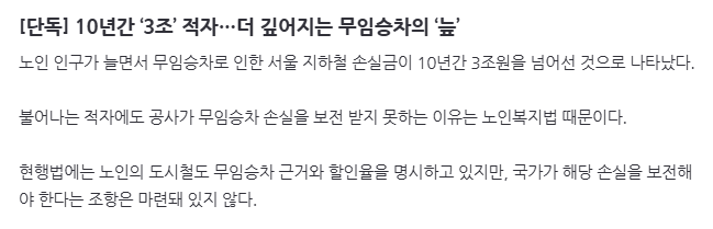 [단독] 10년간 ‘3조’ 적자…더 깊어지는 무임승차의 ‘늪’