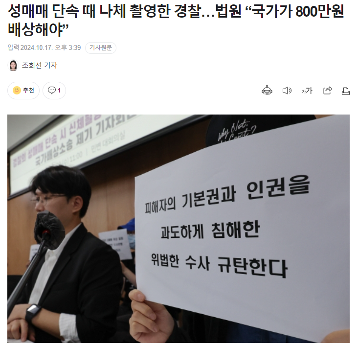 성매매 범죄 단속을 하던 경찰관에게 알몸을 촬영 당한 성매매 여성이 국가를 상대로 손해배상을 청구해 1심에서 일부 이겼다.
