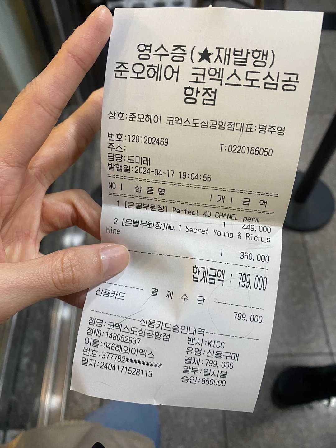 또한 헤어제품을 사라며 50만원가량 더 비용을 추가하셨지만, 제 친구는 안 산다고 한 후에 80만원을 결제하였습니다.
