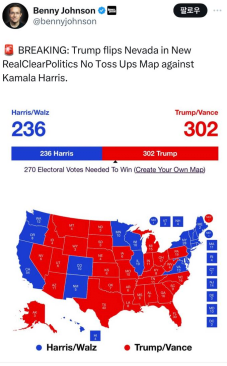 트럼프가 선거인단 302명 확보한다고 글 쓴 배니 잰슨이라는 놈 유명한 마가임 이놈 X보면 죄다 해리스,윌즈를 비방하거나 트럼프 지지를 선언하는 글 투성이임