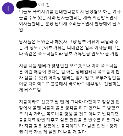 동덕여대 폭력시위 반대 재학생팀 영상에 달린 한 댓글..