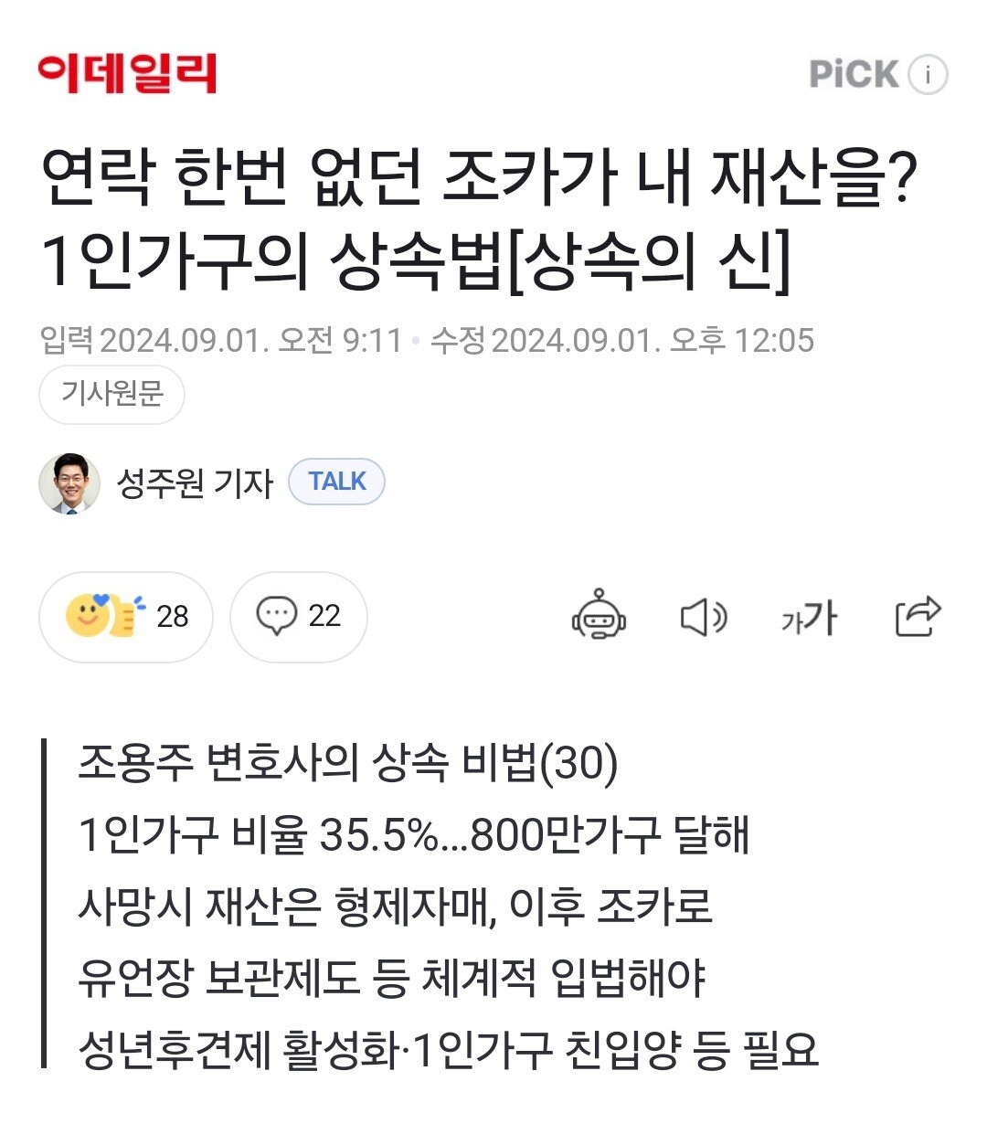 1인 가구인 사람의 걱정은 자신이 갑자기 죽은 후에 누군가에 의해 발견되는 것이다. 그리고 자신들이 평생 일궈놓은 재산을 사후에 어떻게 처리해야 하는지에 대해서도 관심이 많다. 이러한 1인 가구의 증가와 그들의 죽음 이후의 처리방법에 대해 사회가 관심을 많이 가져야 할 때다....(중략)