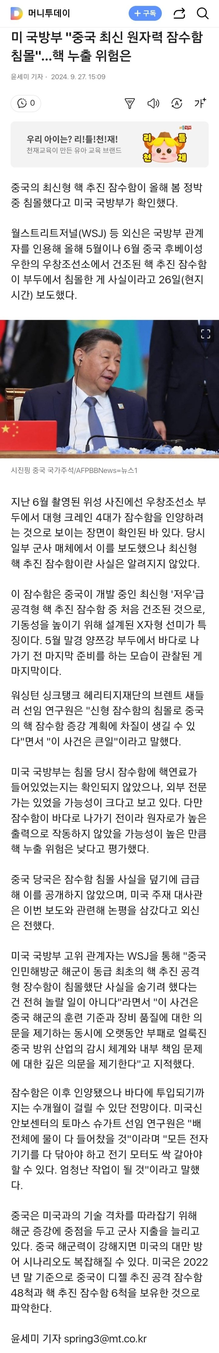 미국 국방부, 중국 핵잠수함 침몰 오피셜