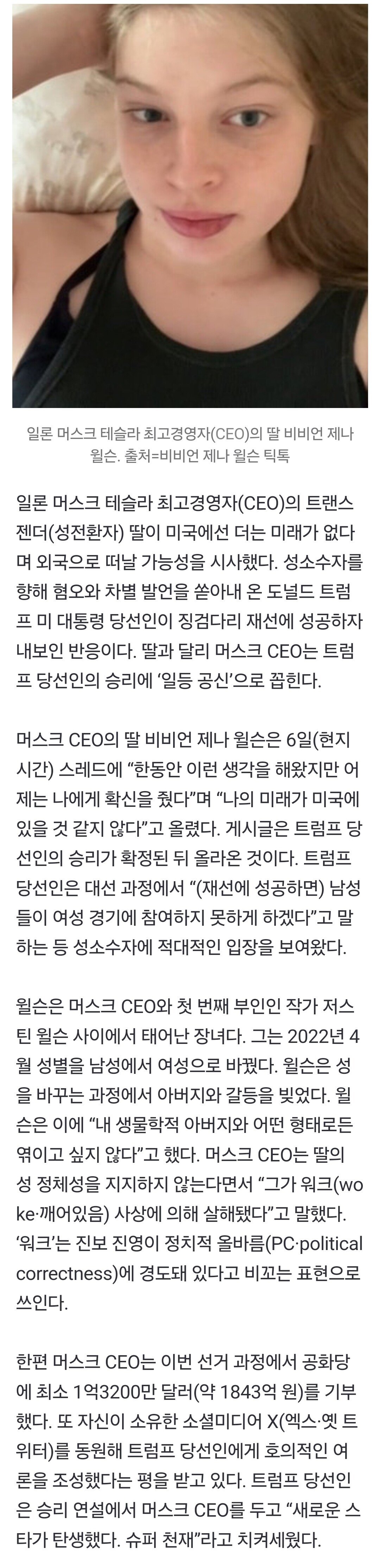 ‘성전환’ 머스크 딸, 트럼프 당선에 “美서 더는 미래 없어”