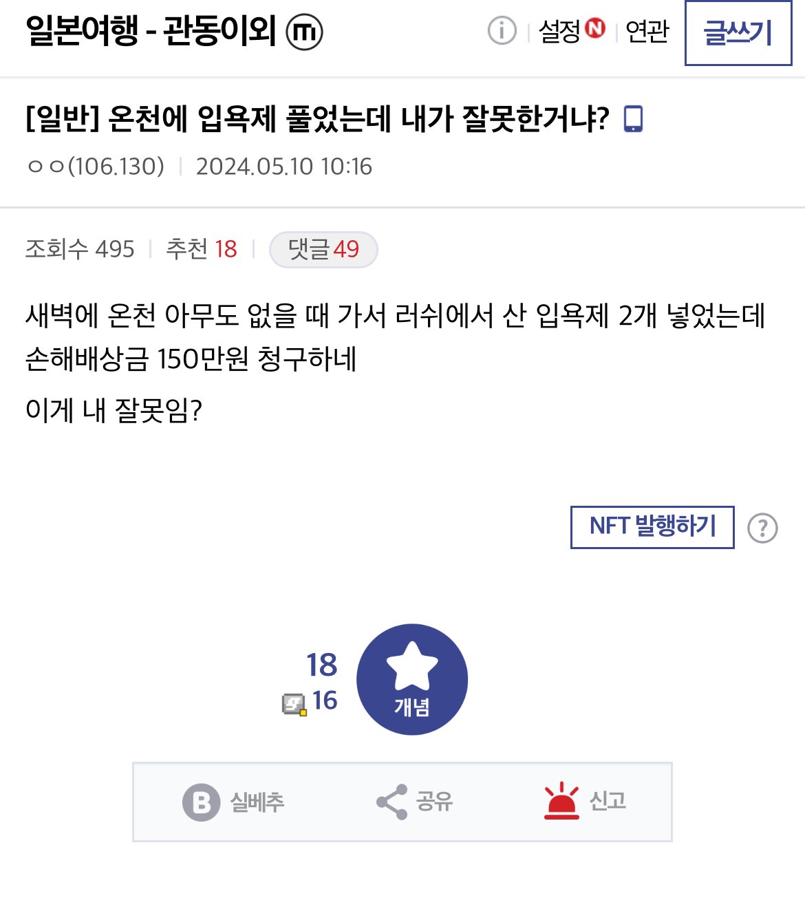일본 온천 갔다가 손해 배상금 150만원 청구 받은 관광객