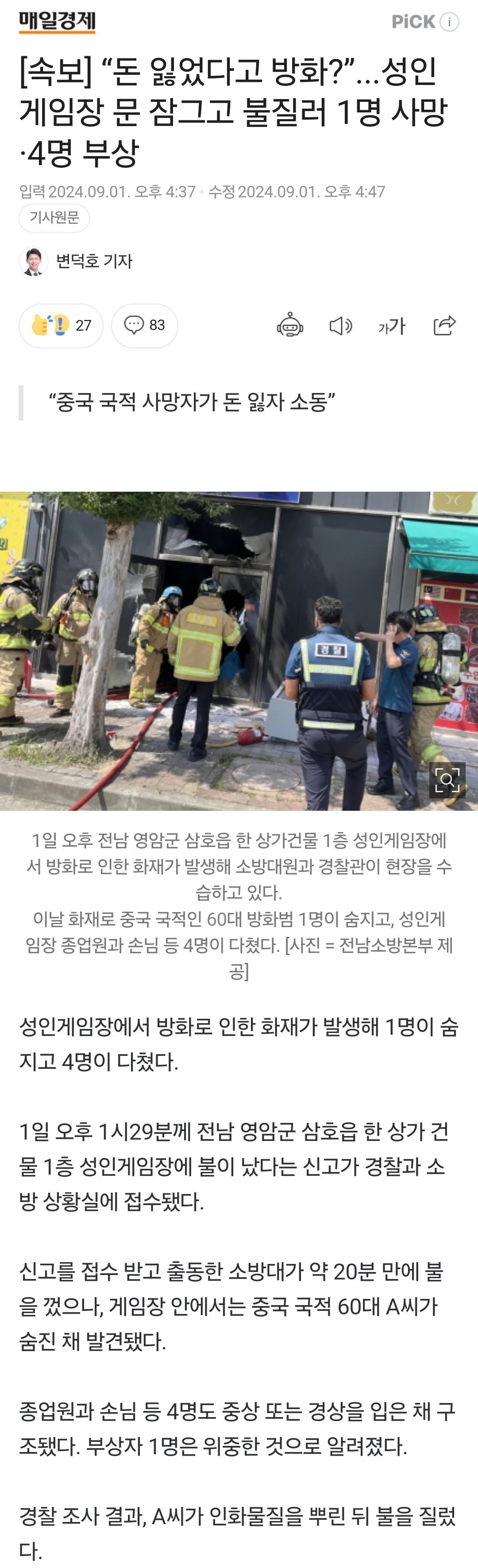 속보! 중국인이 돈 잃었다고 성인게임장 방화