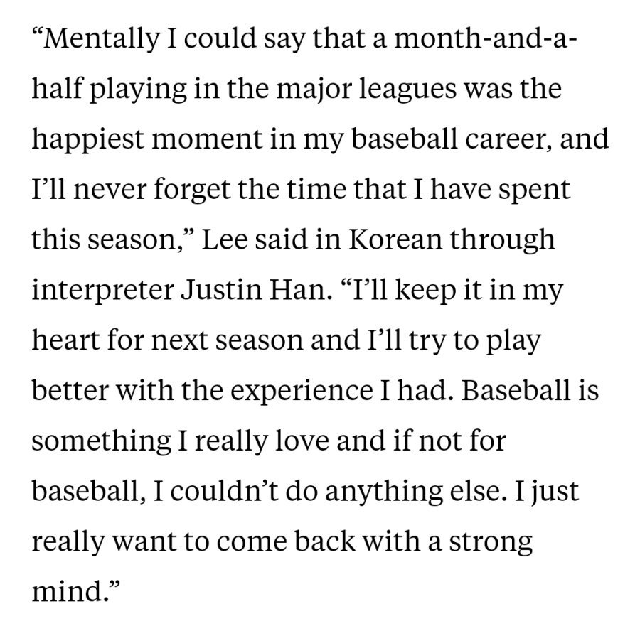 "정신적으로 확실히 말할수 있는건 메이저리그에서의 지난 한달반 동안이 내 야구 커리어에서 가장 행복한 시간이었고 이번 시즌을 보냈던 지난 시간은 결코 잊을수 없을 것이다.