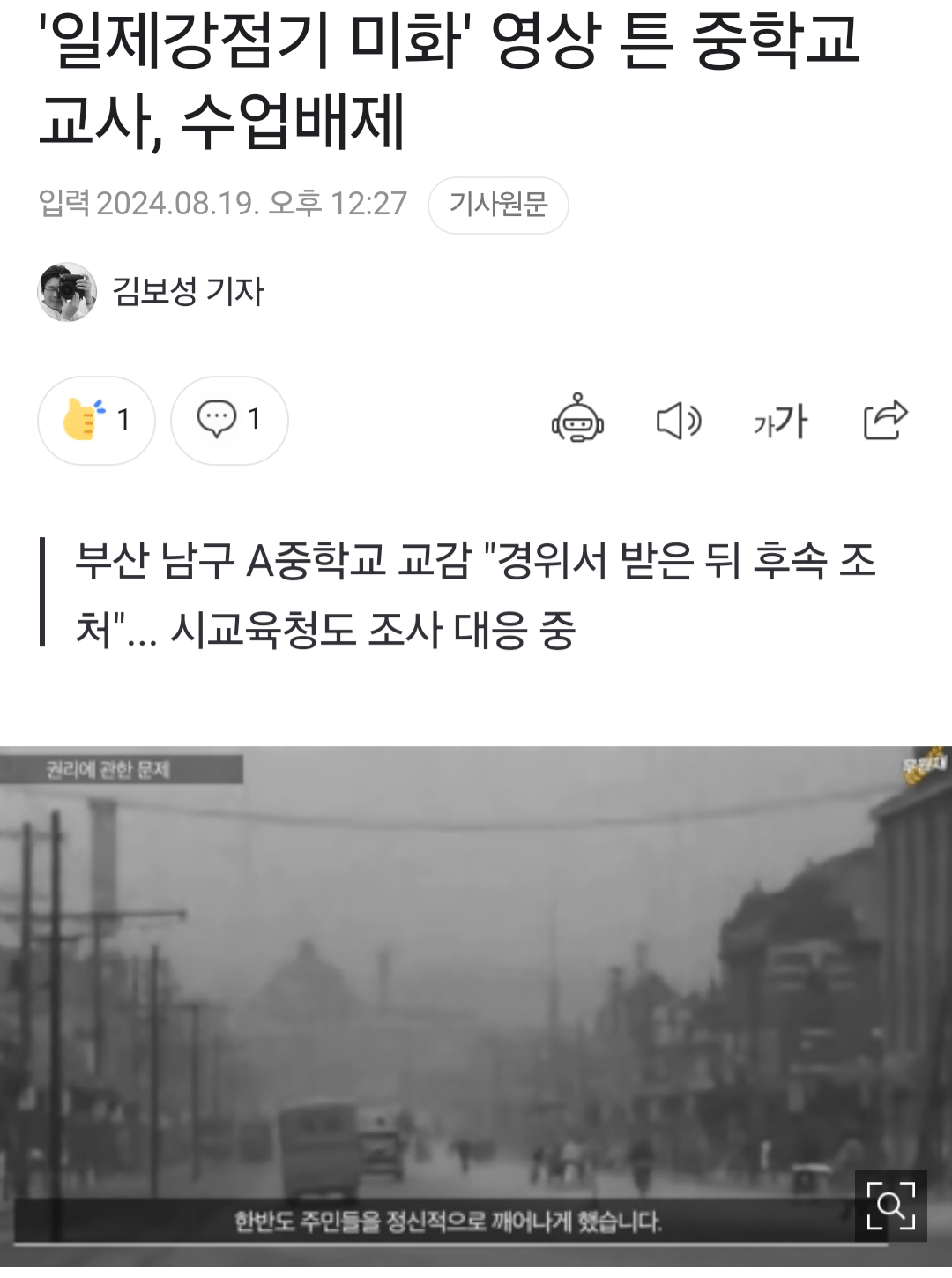 '일제강점기 미화' 영상 튼 중학교 교사, 수업배제