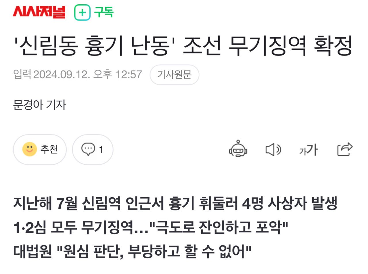 신림역 근처에서 흉기를 휘둘러 4명의 사상자를 낸