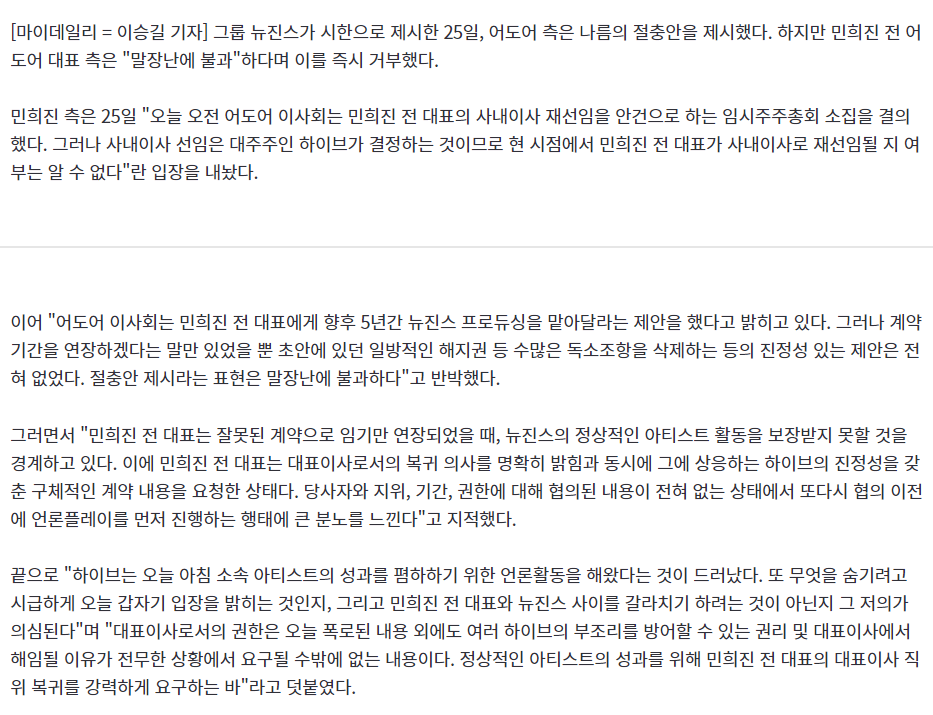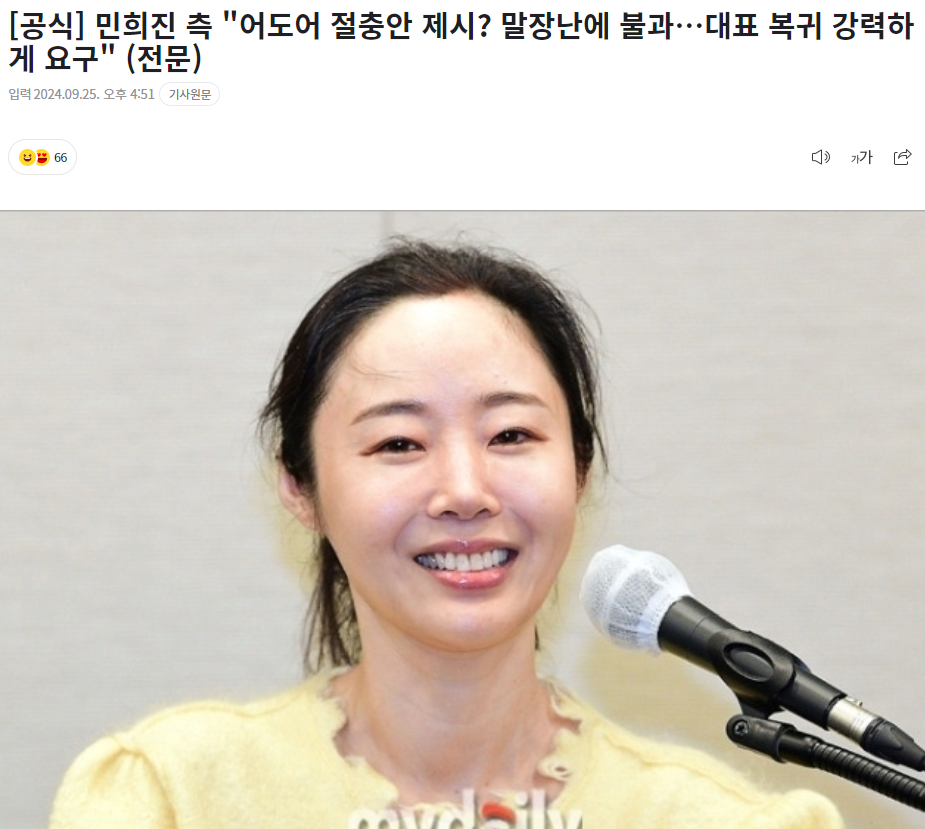 [공식] 민희진 측 "어도어 절충안 제시? 말장난에 불과…대표 복귀 강력하게 요구" (전문)