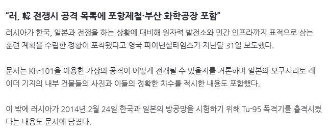 “러, 韓 전쟁시 공격 목록에 포항제철·부산 화학공장 포함”