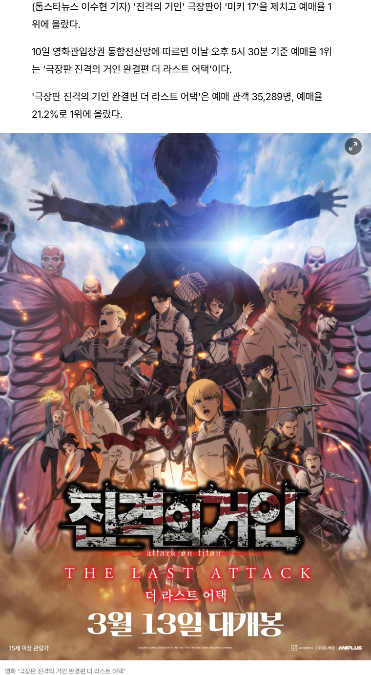 '진격의 거인' 극장판이 '미키 17'을 제치고 예매율 1위