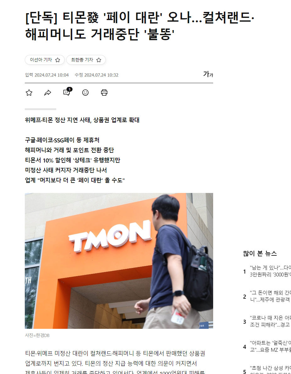 국내 1위 상품권인 컬쳐랜드 역시 티몬발(發) 사태로 전날부터 SSG페이 등 제휴처들과 거래가 중단됐다.