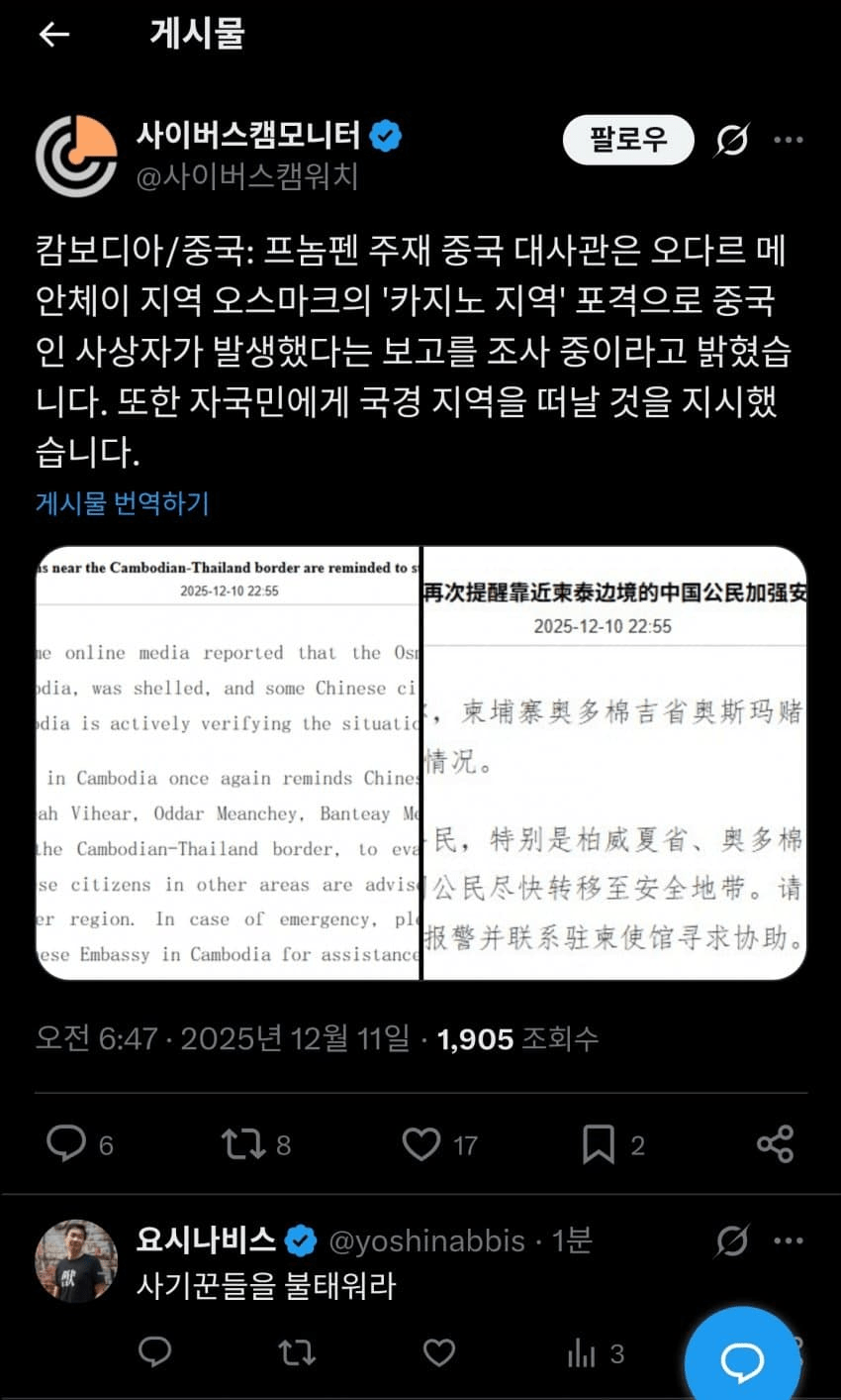 태국이 공습한 캄보디아 범죄단지에서 중국인 사상자 발생