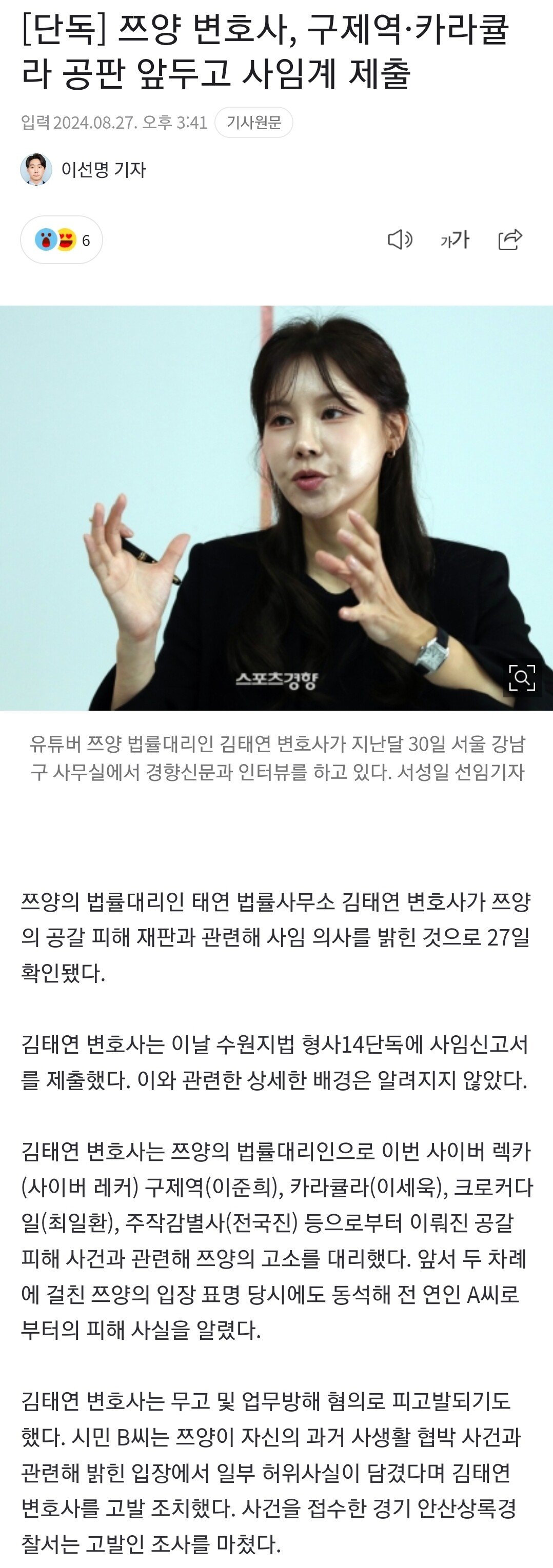 [단독] 쯔양 변호사, 구제역·카라큘라 공판 앞두고 사임계 제출