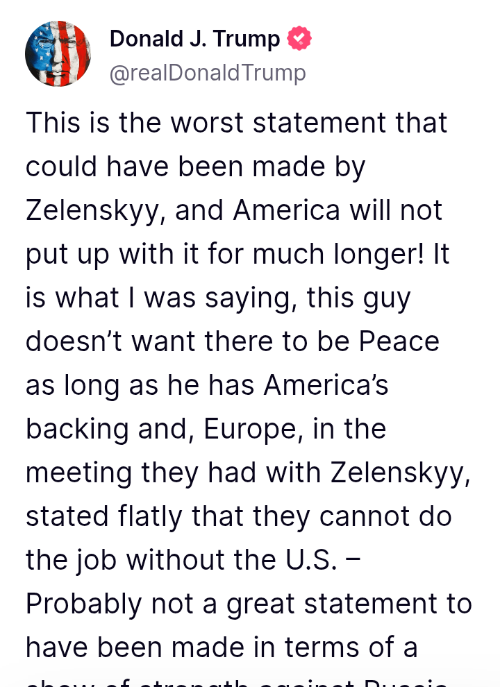 트럼프 : 이 최악의 사태는 모두 젤렌스키에 의해 벌어진 것이며, 더이상 미국은 이를 지원하지 않을것이다.