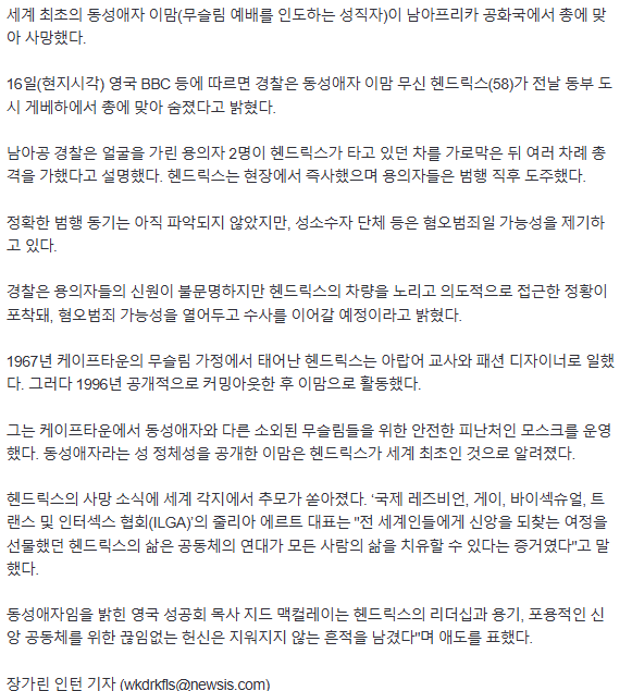 세계 최초 '동성애자 이슬람 성직자'…남아공서 총 맞아 사망