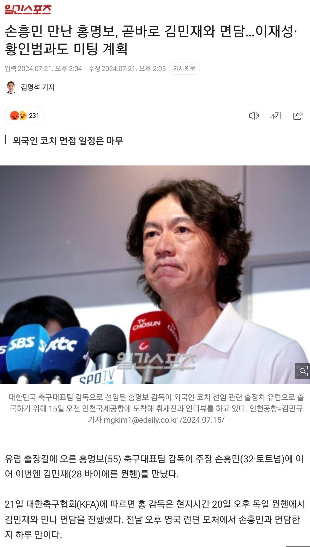 손흥민 만난 홍명보, 곧바로 김민재와 면담…이재성·황인범과도 미팅 계획