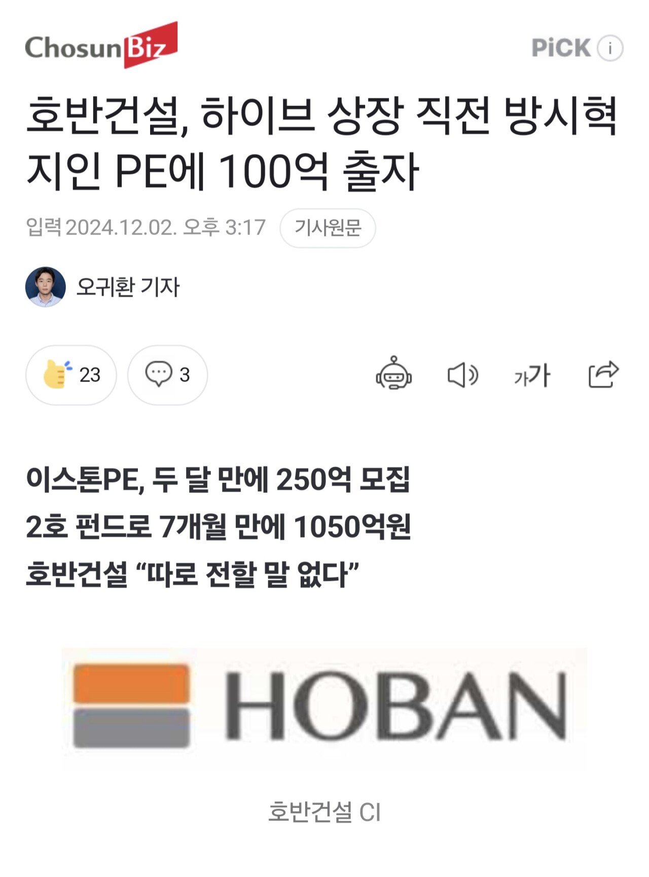 2차 격추 재업) 호반건설, 하이브 상장 직전 방시혁 지인 PE에 100억 출자