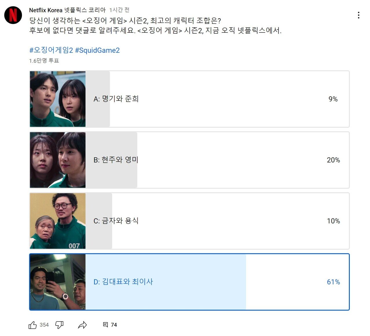 스포) 오징어게임2 최고의 캐릭터 조합 투표 근황