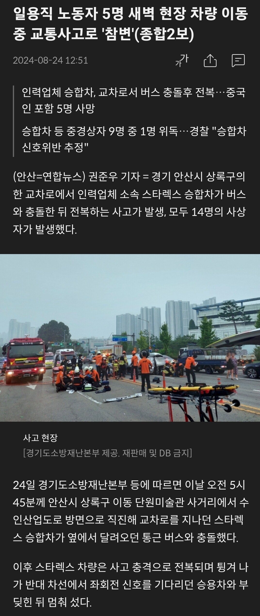 일용직 노동자 5명 새벽 현장 차량 이동 중 교통사고로 '참변'(종합2보)