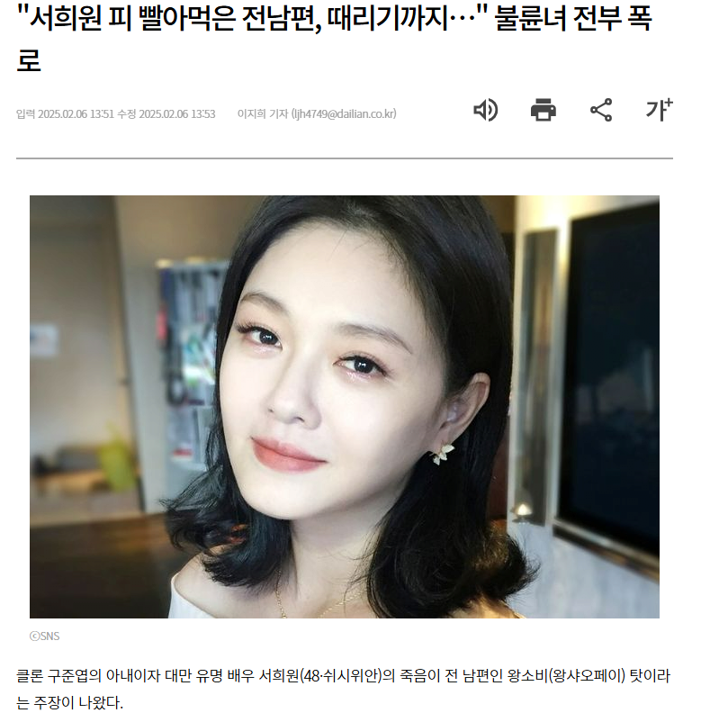 클론 구준엽의 아내이자 대만 유명 배우 서희원(48·쉬시위안)의 죽음이 전 남편인 왕소비(왕샤오페이) 탓이라는 주장이 나왔다.