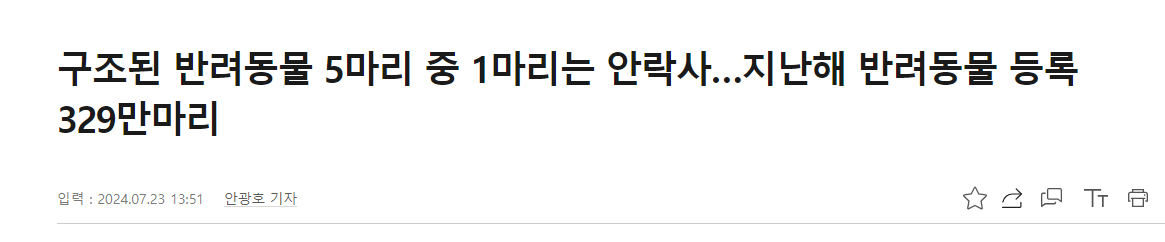 지난해 전국 동물보호센터 등을 통해 구조된 개와 고양이 등 반려동물 5마리 중 1마리는 보호자를 찾지 못하고 안락사하는 것으로 나타났다. 지방자치단체에 등록된 반려동물 개체 수는 전년에 비해 7% 가량 늘어난 약 329만마리로 집계됐다.
