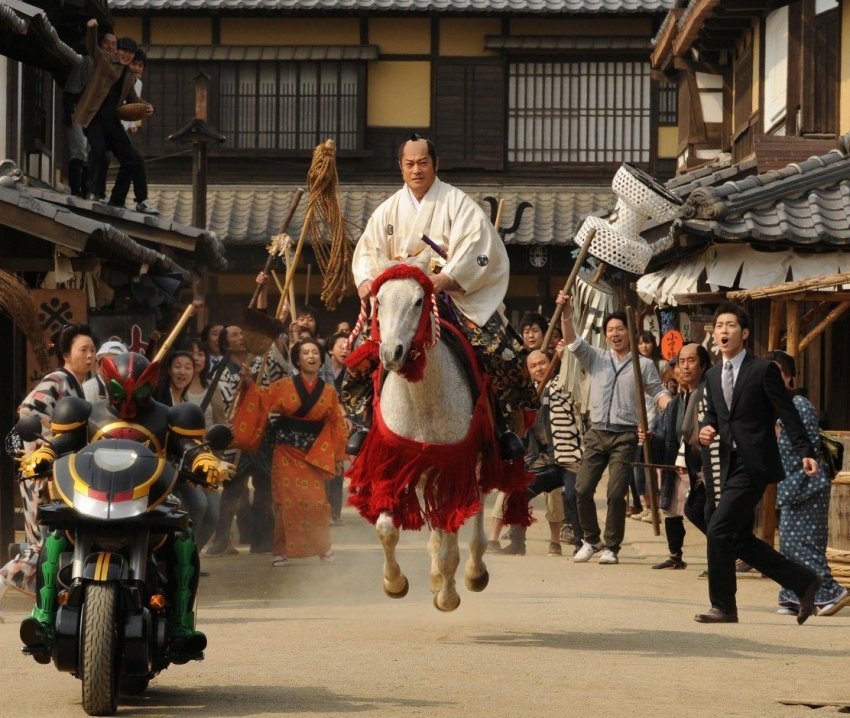 중세 일본에서 말타고 달려가는 쇼군을 보며 놀라는 양복남과 오토바이 타고 달려나가는 가면라이더