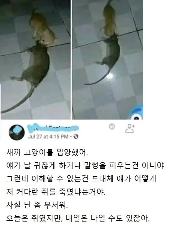공포를 느낀 새끼고양이를 입양한 사람