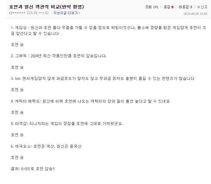 호연과 원신 객관적 비교