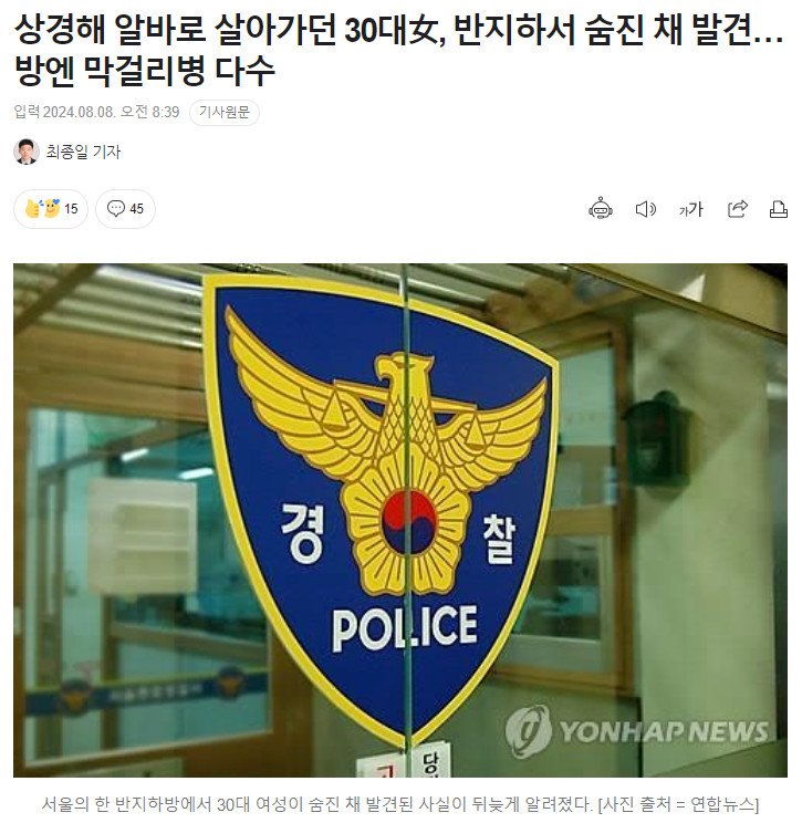 상경해 알바로 살아가던 30대녀, 반지하서 숨진 채 발견 ㄷㄷㄷ
