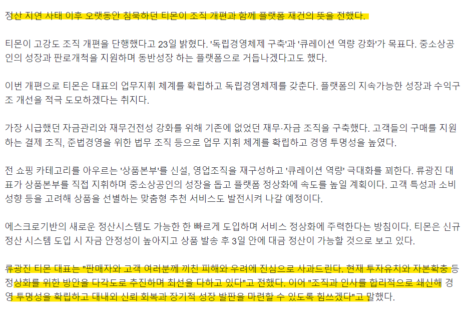 티몬 "플랫폼 정상화 시동"… 조직 개편하고 다시 뛴다