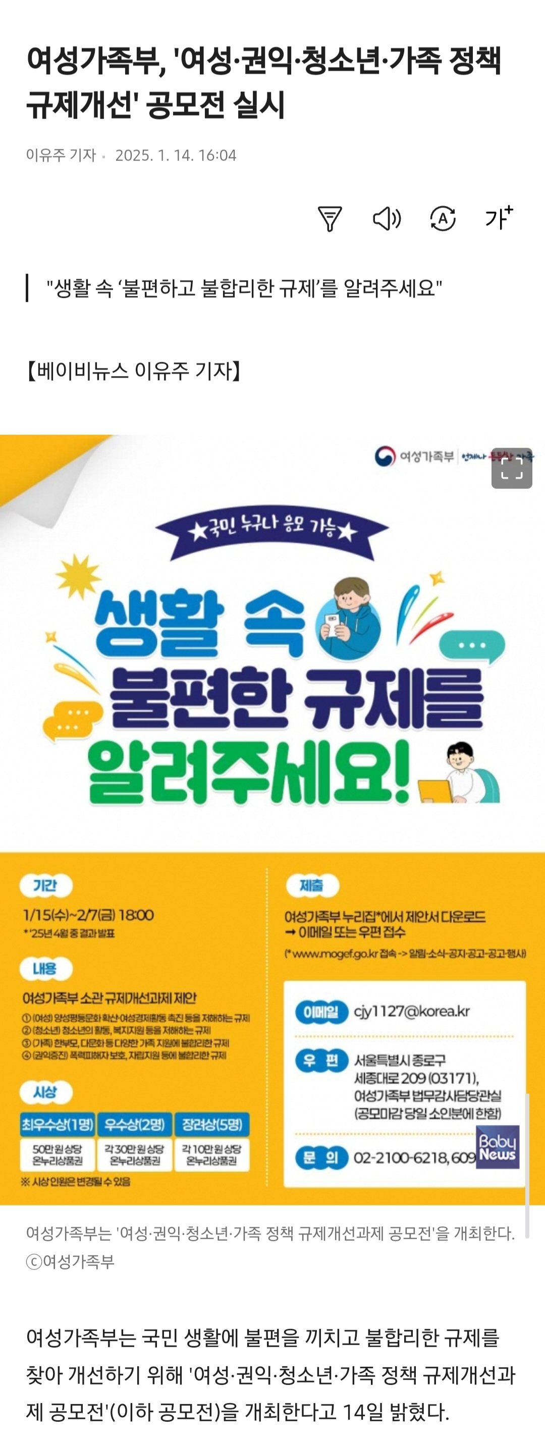"생활 속 ‘불편하고 불합리한 규제’를 알려주세요" 여성가족부 공모전 개최