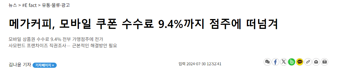 30일 업계에 따르면 메가커피는 카카오톡 선물하기 쿠폰 수수료 9.4%를 전부 가맹점주에게 전가시키는 것으로 나타났다. 메가커피는 우윤파트너스와 프리미어파트너스 등 사모펀드가 소유한 회사다.