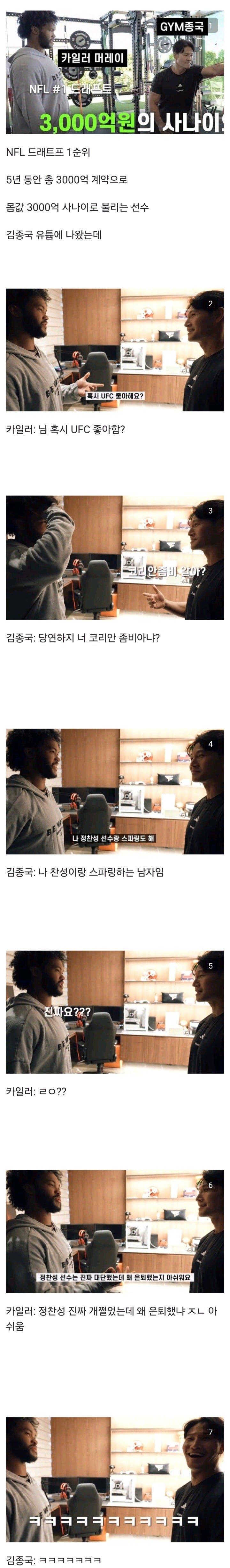 김종국 유튜브에서 UFC 정찬성 은퇴한거 아쉽다는 NFL 선수