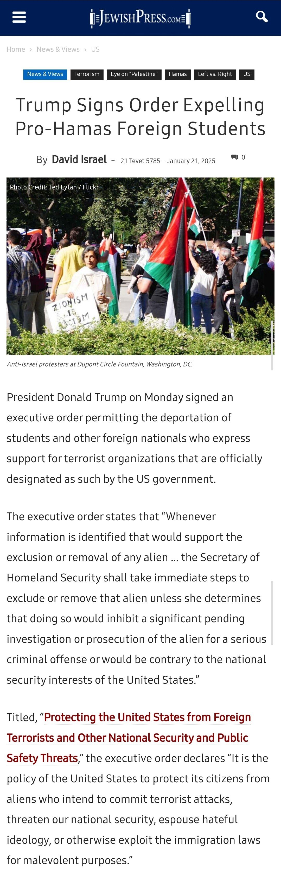 트럼프, 하마스 지지 선언 학생 추방 명령.