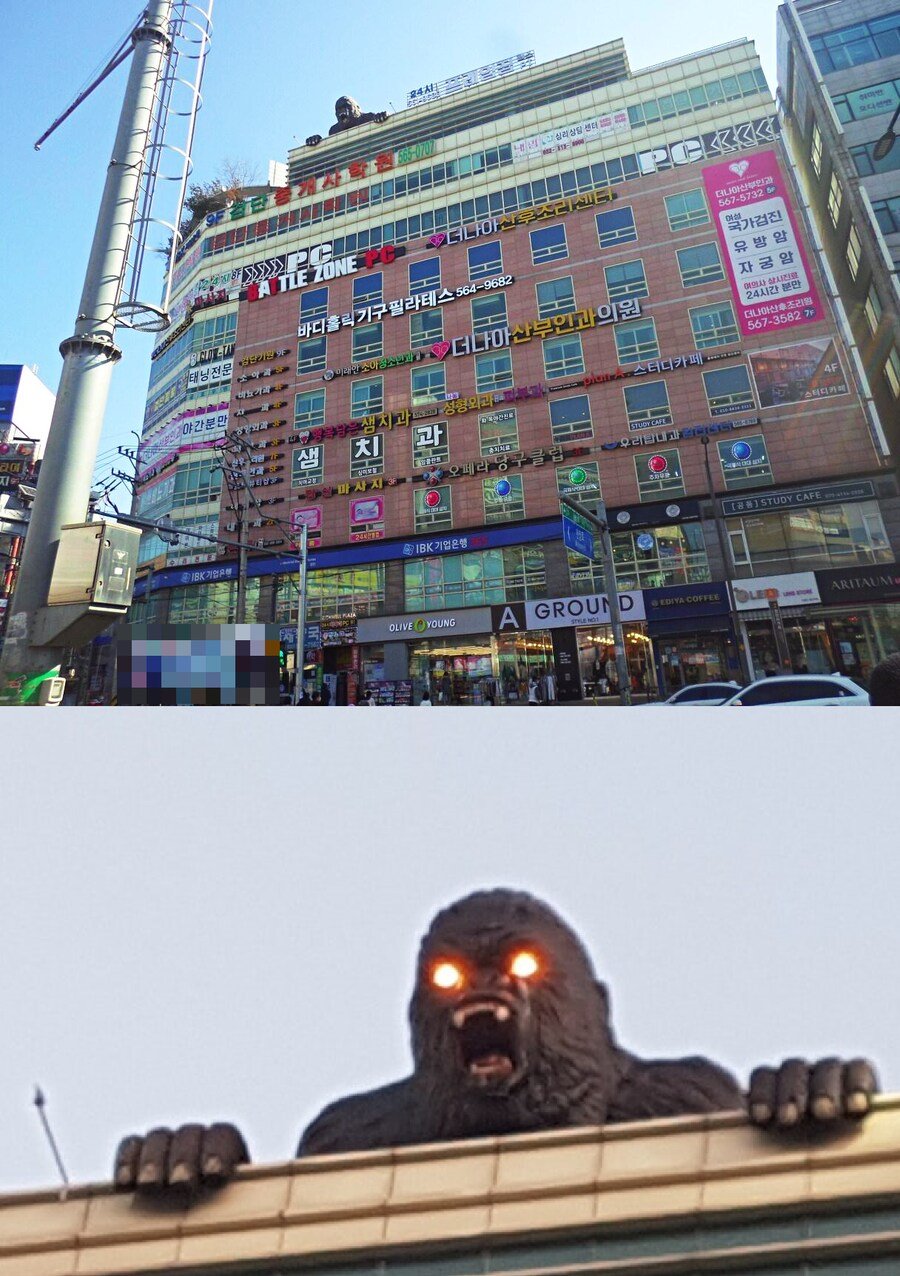 그것은 바로 건물 옥상에 숨은 거대킹콩이다.