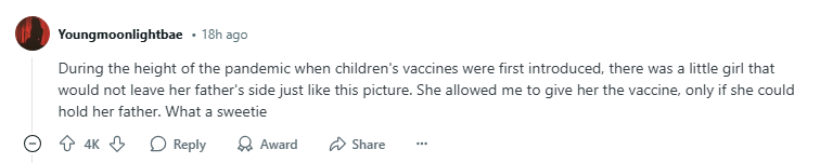 팬데믹 중 아동용 백신이 처음 도입되었을 때, 이 사진처럼 아버지 곁을 떠나지 않던 작은 소녀가 있었어요.