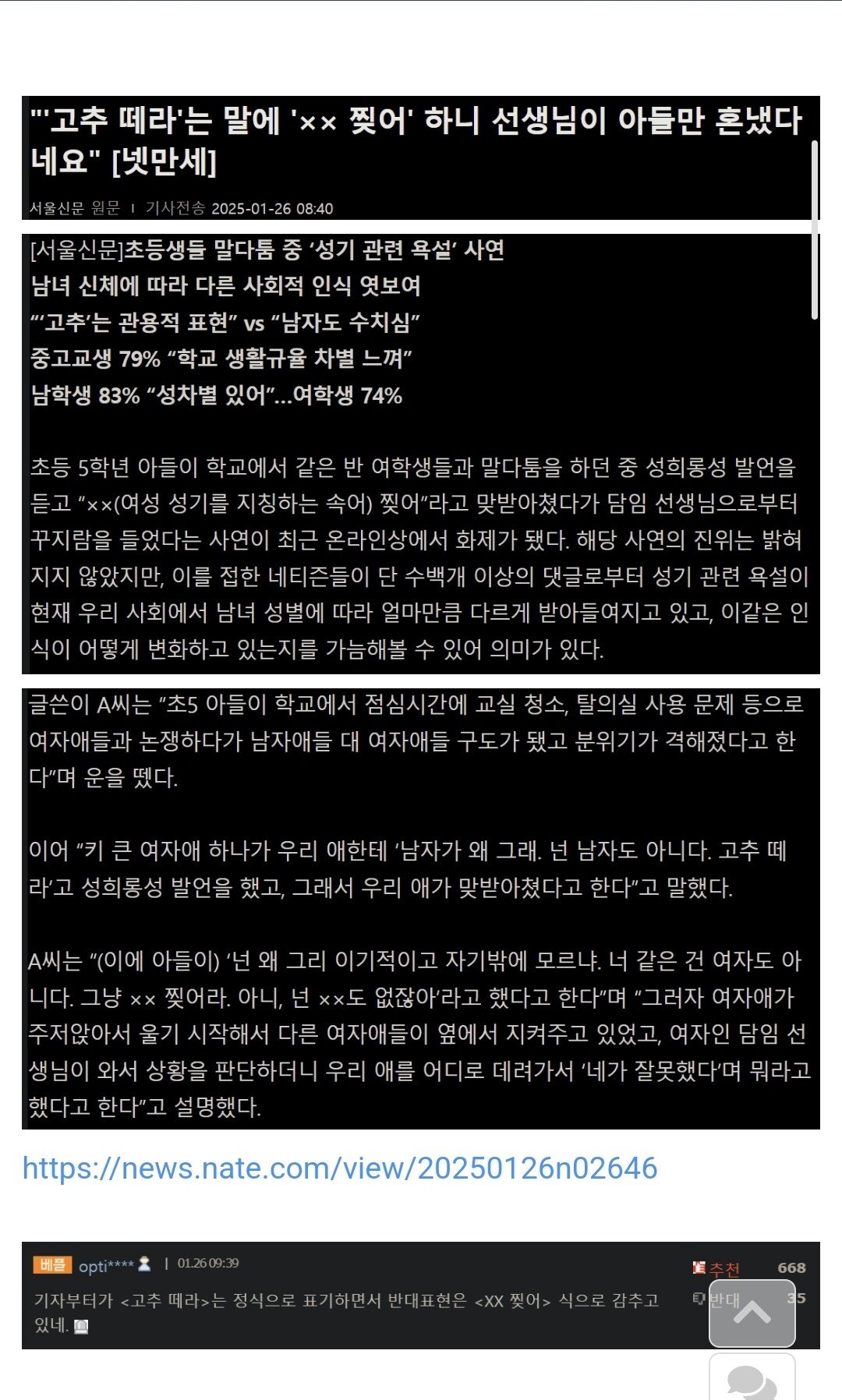 ‘고추 떼라‘에 ‘XX 찢어‘라고 응수한 아들... 선생님이 아들만 혼냄...